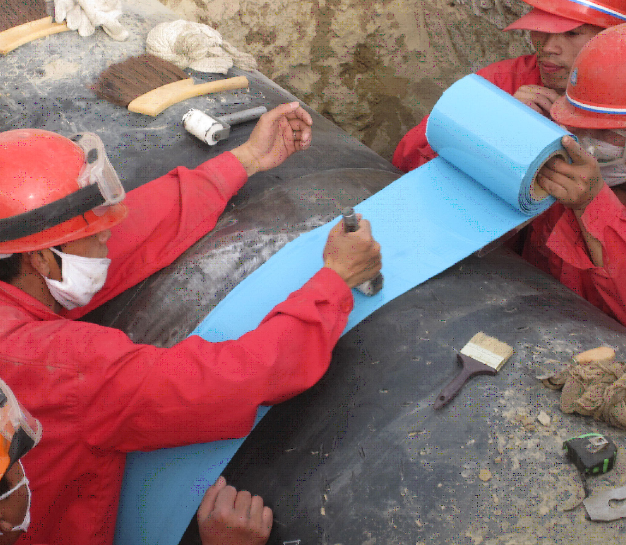 粘彈體防腐膠帶的涂層瀝青涂料溫度低于100℃時,聚氯乙烯工業薄膜保護層不得折疊、剝落。壓邊寬度30-40mm,搭接長度100-150mm。